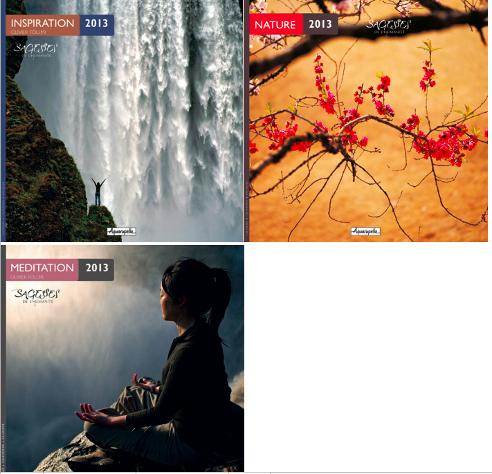 Les calendriers Sagesses 2013 ! Ajouté le octobre 29, 2012 à 2:08 Les calendriers « Sagessses de l’humanité » 2013 sont en vente ! Ci-dessous les couvertures des 7 calendriers vendus par Aquarupella. Spirit of India, Kids, Travel, et Smile Inspiration, Nature et Méditation.