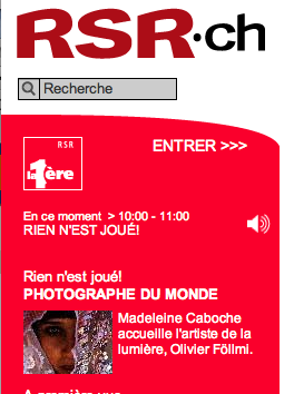 Olivier Föllmi sur Radio Suisse Romande Ajouté le novembre 30, 2009 à 9:30 Olivier Föllmi est l’invité de Madeleine caboche, dans l’émission « Rien n’est joué », sur Radio Suisse Romande, à écouter aujourd’hui en direct, de 10 à 11 h, ou à podcaster ! http://www.rsr.ch/la-1ere/rien-n-est-joue/selectedDate/30/11/2009#20091130-photographe-du-monde
